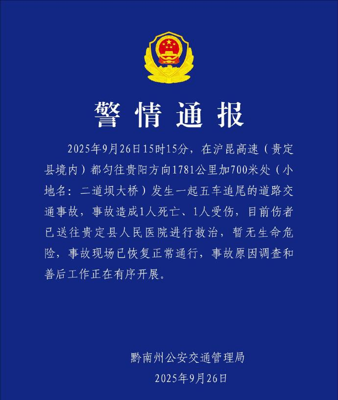 9月26日15时15分,在沪昆高速(贵定县境内)都匀往贵阳方向1781公里加700米处(小地名:二道坝大桥)发生一起五车追尾的道路交通事故,事故造成1人死亡、1人受伤,目前伤者已送往贵定县人民医院进行救治,暂无生命危险,事故现场已恢复正常通行,事故原因调查和善后工作正在有序开展。