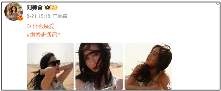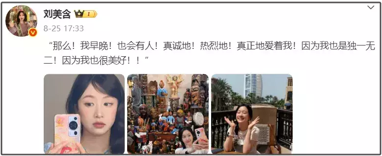 而看刘美含近几日的博文,晒各种旅游照,文案都是围绕感情相关,不是疑惑“什么是爱”,就是感慨“早晚有一天会有人真诚热烈的人来爱我”,还看似礼貌的“你赠我一场空欢喜,我愿你扶摇直上九万里”,这些文案都暴露了她对感情失败的不甘,故作轻松。