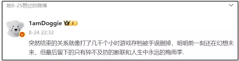 更值得一提的是,网友发现两人已经取关了微博,更加说明有情况。结合种种的细节来看,张远和刘美含这是恋爱没谈成,朋友也没得做了,而且还是闹得极为不愉快的那一种。在这之前,刘美含还点赞了一条谈论感情的博文,文案形容断崖式结束感情就像游戏删档,前一刻幻想未来下一秒迎来的是猝不及防的断联。不知刘美含是不是感同身受了,可能也刚刚遭遇了断崖式分手。
