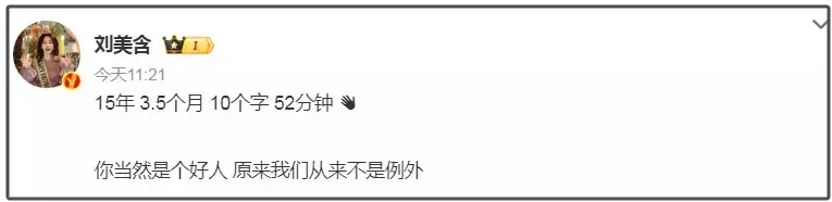 有网友解读称刘美含说的是“与认识15年的人恋爱了3个半月,最终用十个字告别了恋情,沟通了52分钟”,而这句“你当然是个好人,原来我们从来不是例外”大概是男方宣布感情结束的文案。